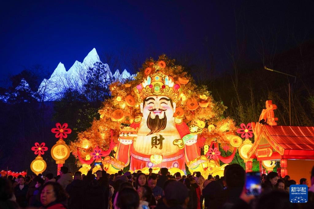 1月14日在第31届自贡国际恐龙灯会上拍摄的彩灯灯组《喜迎财神》。