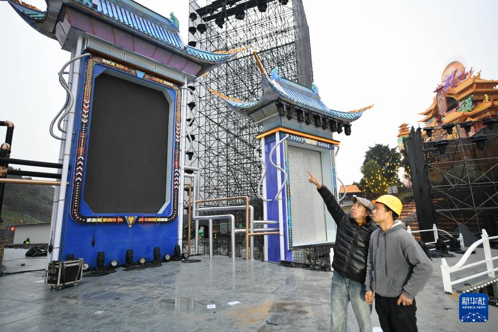 在第31届自贡国际恐龙灯会主舞台现场,万松涛(左)与工作人员商讨细节,确保最终的呈现效果(1月14日摄)。此次灯会主舞台由高级工艺美术师万松涛和团队一同设计完成,造型采用了自贡当地一处古建筑元素,部分细节由废旧工业管道等综合材料组成。