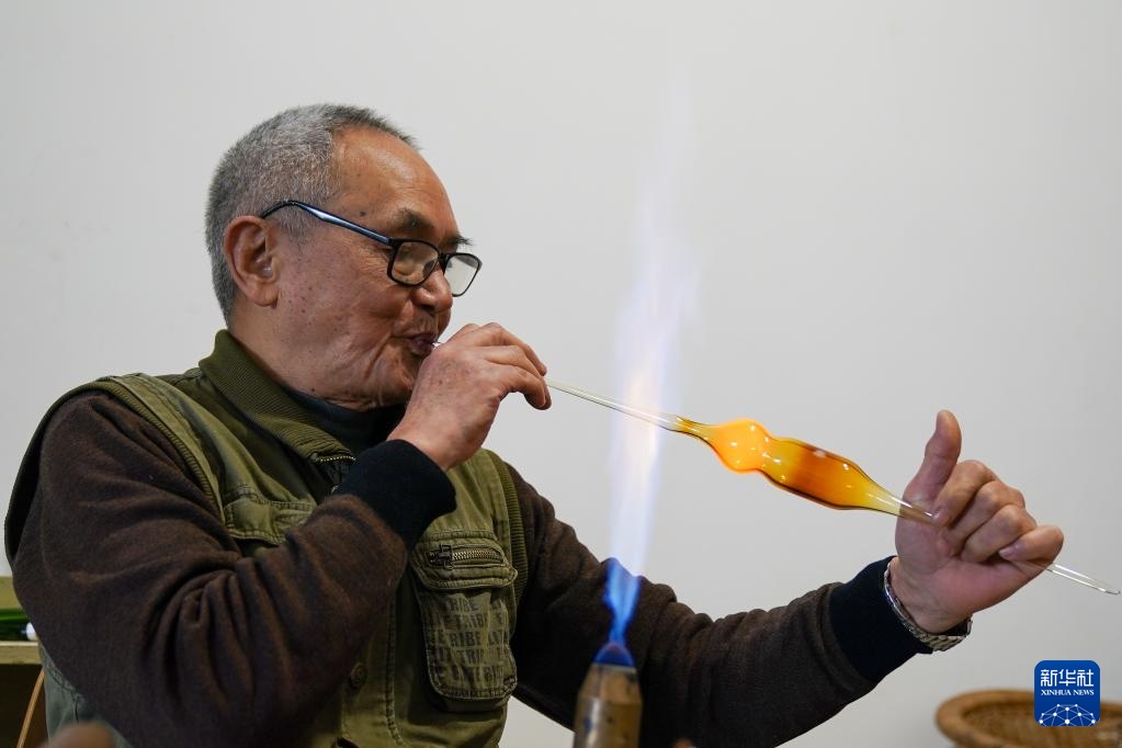 自贡灯会有一项特色灯组“玻璃吹塑灯”,四川省级非物质文化遗产“玻璃吹塑技艺”代表性传承人彭正华在吹塑成型(1月15日摄)。