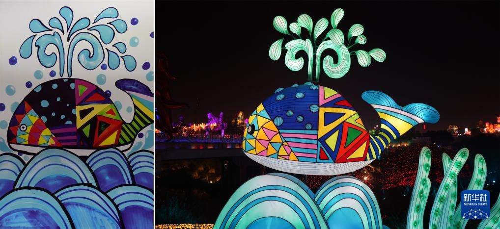 拼版照片:左图为一名小朋友的绘画作品《喷水的鲸鱼》,右图为彩灯工匠制作出的彩灯版《喷水的鲸鱼》(1月14日摄)。