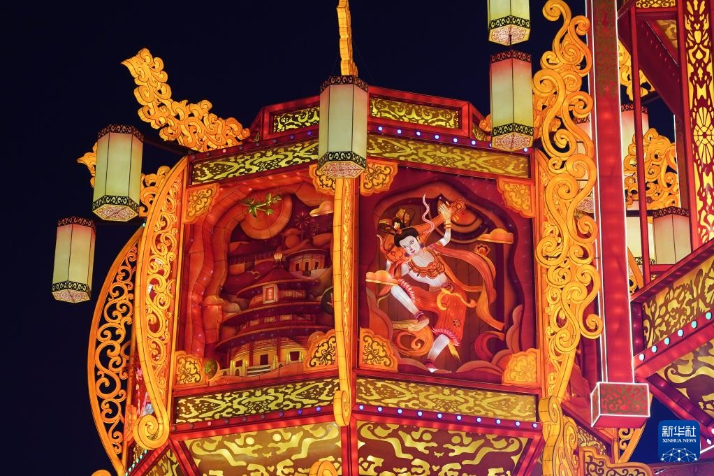 第31届自贡国际恐龙灯会大门灯组局部“祈年殿”和“敦煌飞天”(1月17日摄)。
