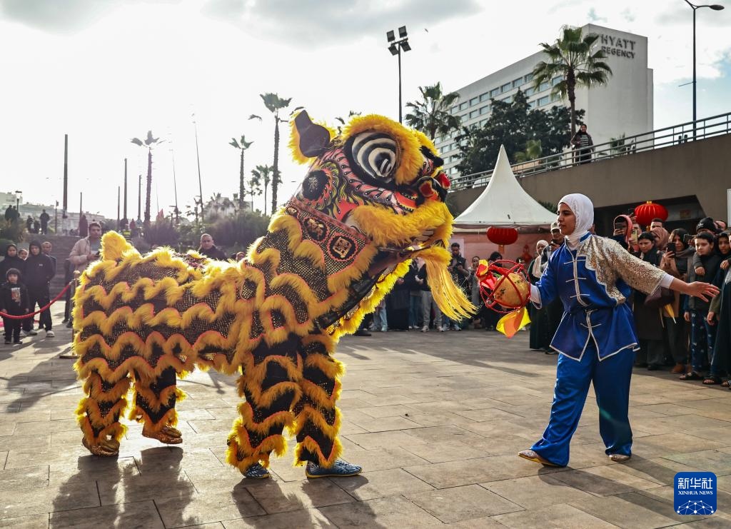 1月17日,在摩洛哥卡萨布兰卡的“中国庙会”活动现场,摩洛哥青年表演舞狮。