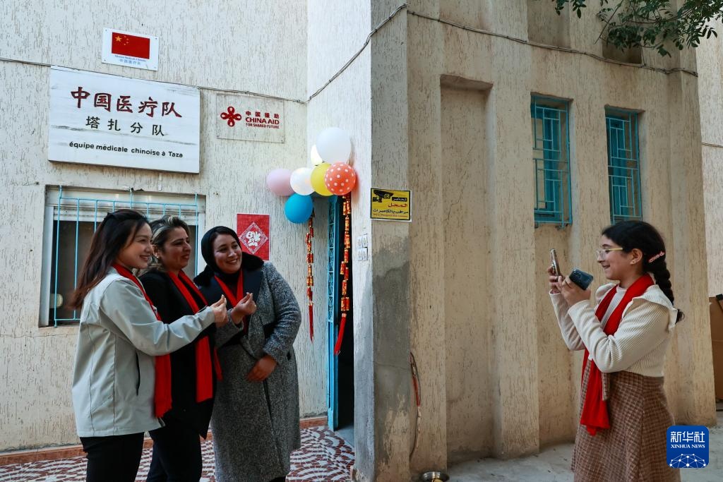 1月27日,在摩洛哥塔扎,中国援摩医疗队塔扎分队队员胡海艳(左一)与摩洛哥民众庆祝春节。