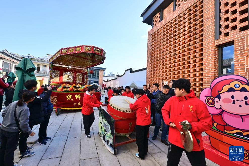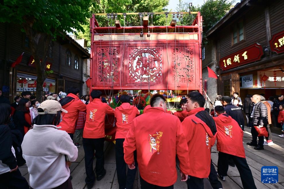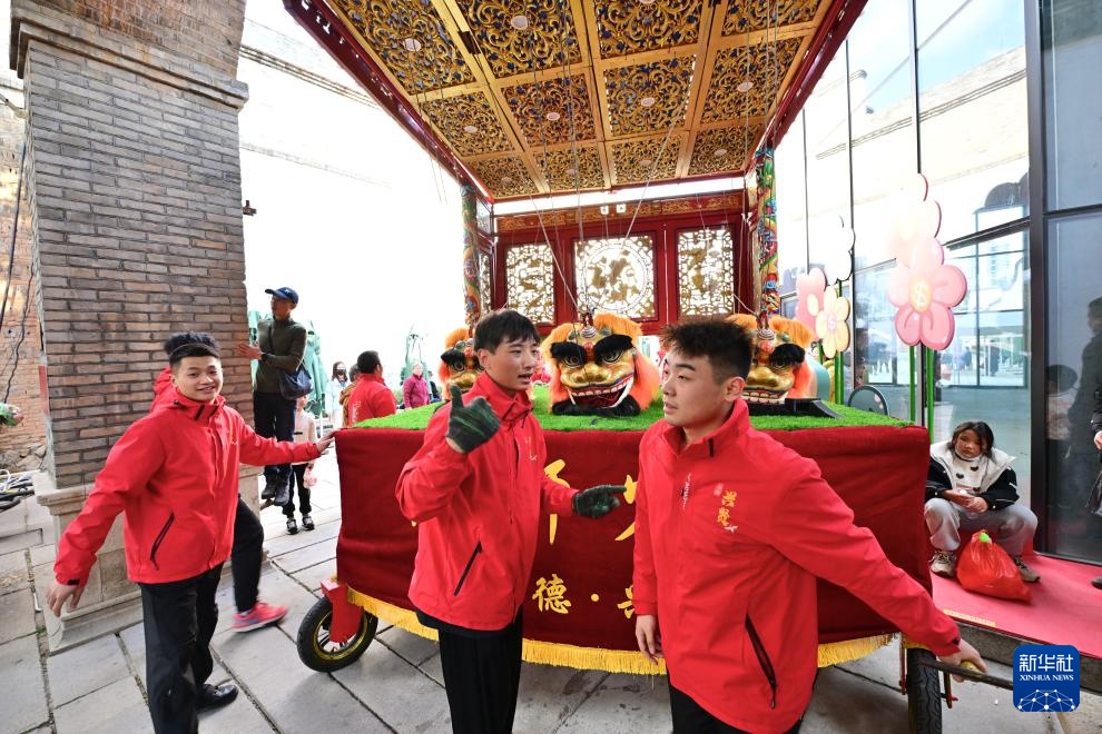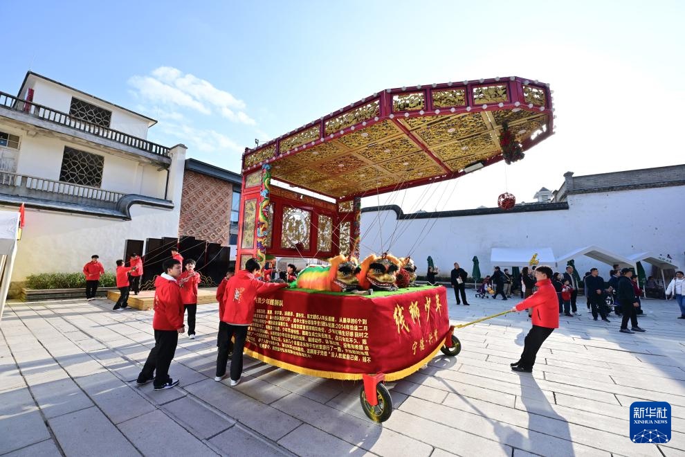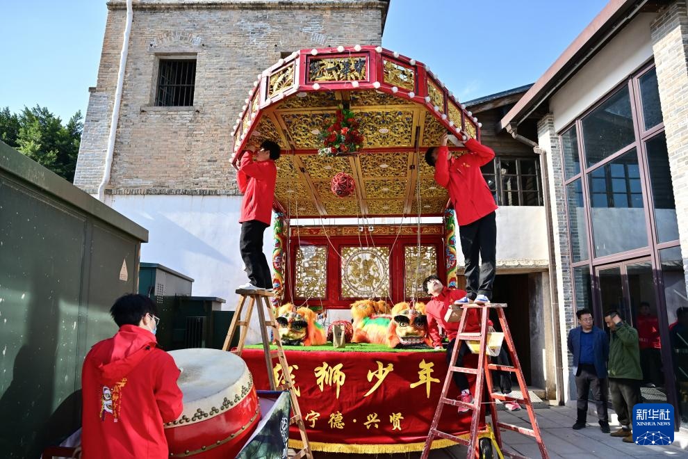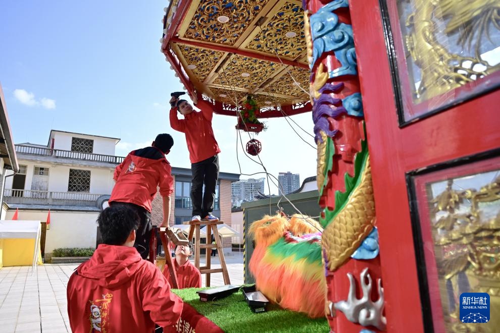 1月30日,在福州市上下杭历史文化街区,兴贤少年线狮队成员将道具转移至表演场地。