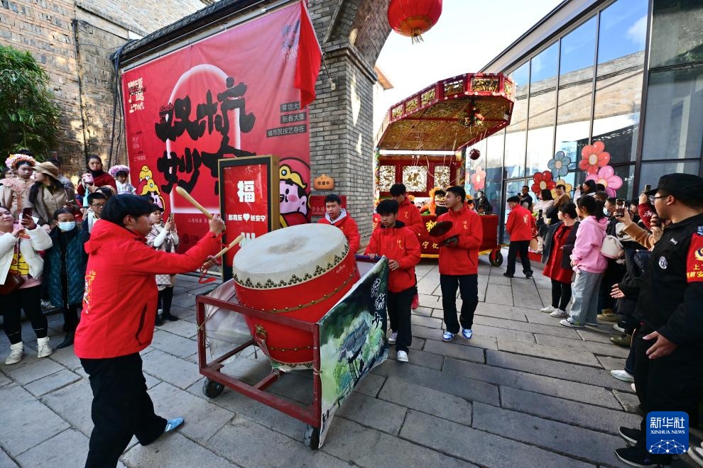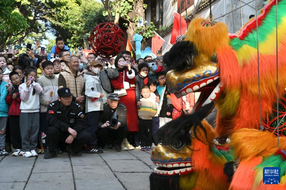 1月30日,人们在福州市上下杭历史文化街区观看兴贤少年线狮队的表演。