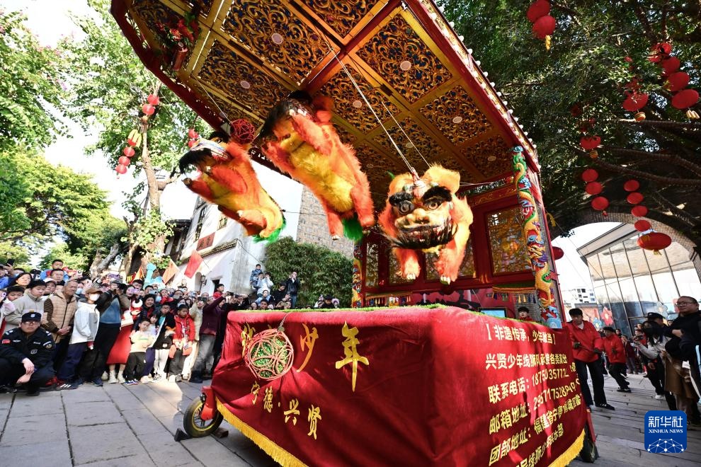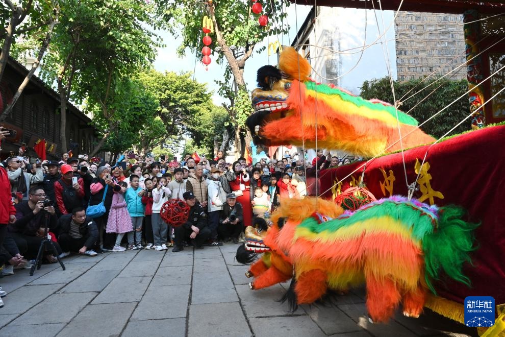 1月30日,兴贤少年线狮队在福州市上下杭历史文化街区表演。