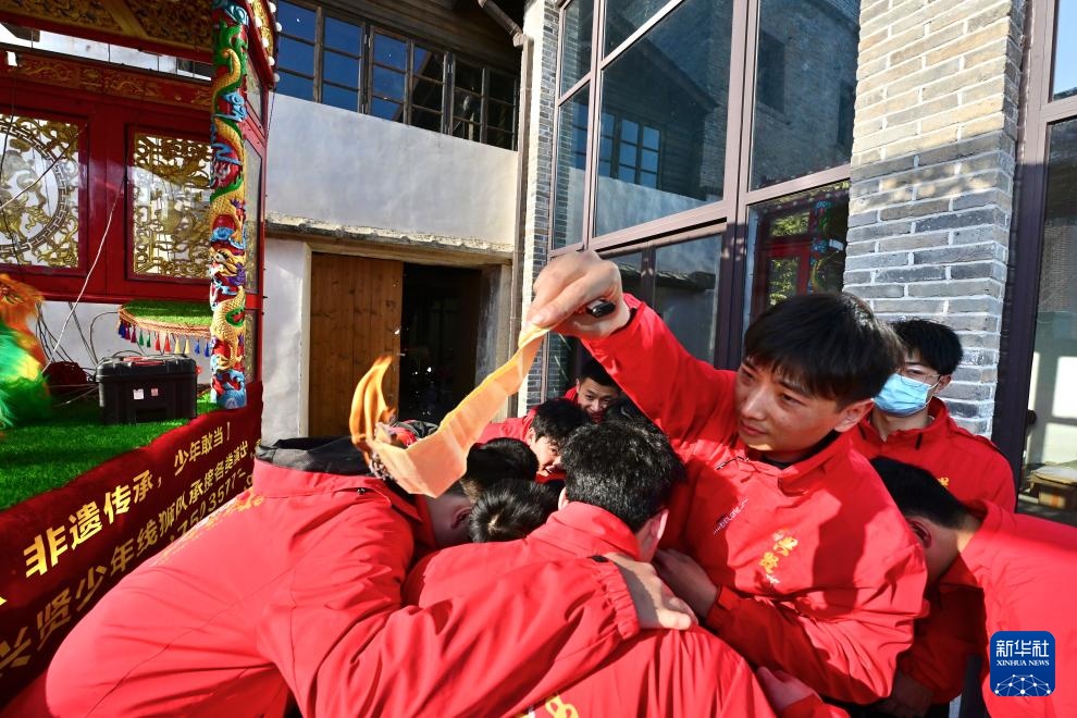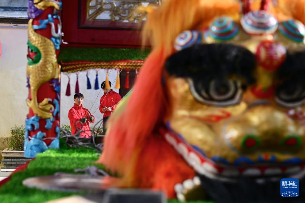 1月30日,在福州市上下杭历史文化街区,兴贤少年线狮队队长陈吉宏(左)在演出前准备。