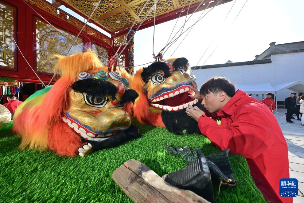 1月30日,在福州市上下杭历史文化街区,兴贤少年线狮队队长陈吉宏在演出前检查道具。