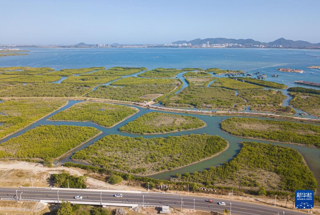 1月31日在海南陵水拍摄的海南环岛旅游公路及其途经的海南陵水红树林国家湿地公园(无人机照片)。