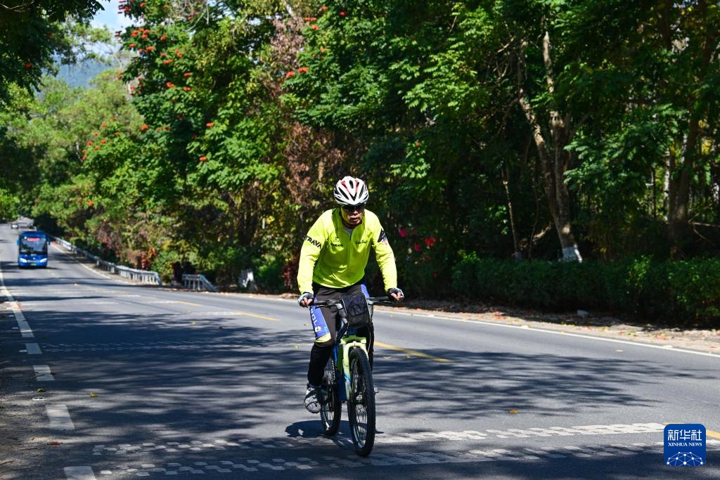 1月30日,游客在环热带雨林国家公园旅游公路保亭段骑行。