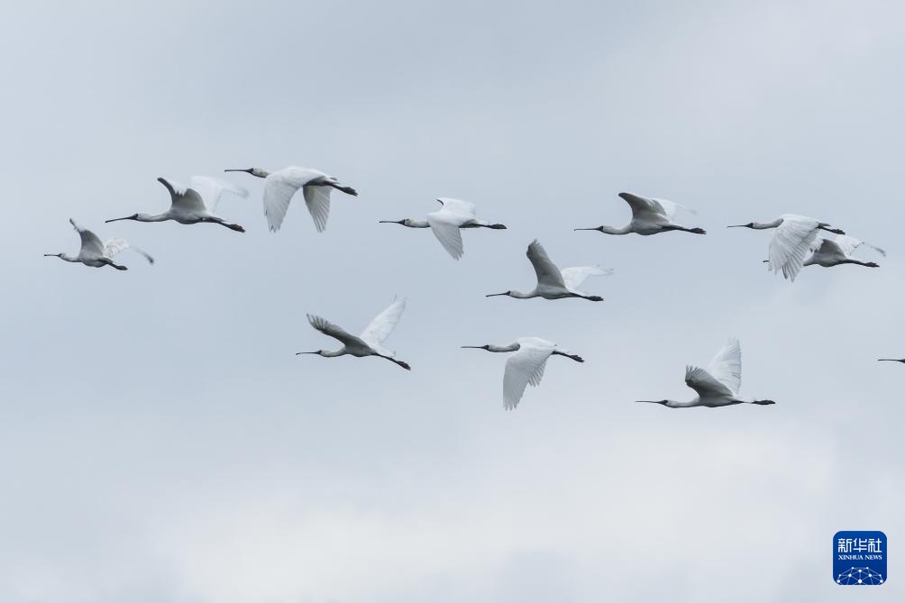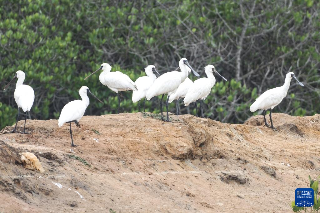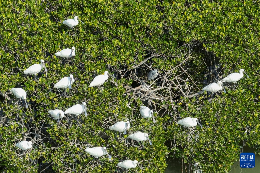 1月18日在海南儋州新盈红树林国家湿地公园拍摄的黑脸琵鹭(无人机照片)。