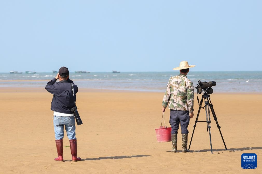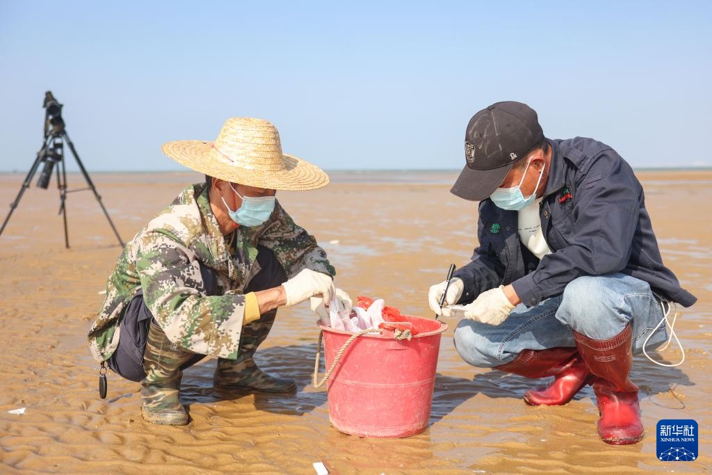 1月18日,罗理想(右)和同事在海南儋州光村银滩做鸟类疫病监测。