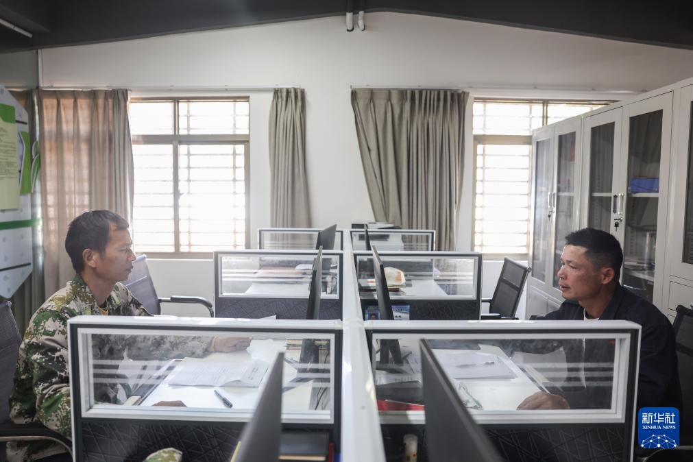 1月18日,罗理想(右)和同事在海南儋州新盈红树林国家湿地公园的科普馆内工作。