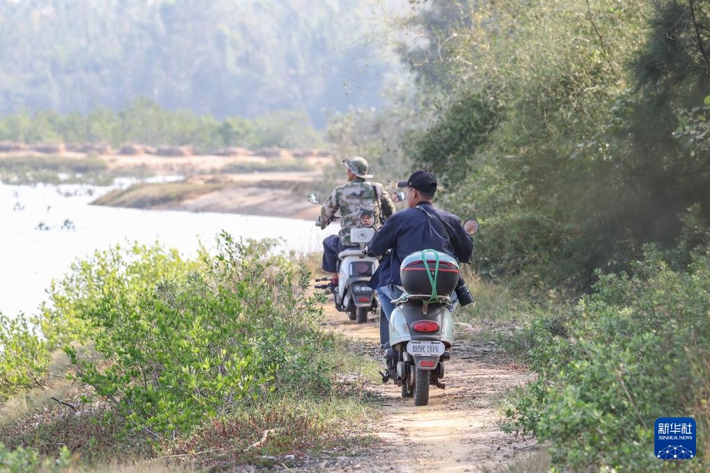 1月18日,罗理想(右)和同事在海南儋州新盈红树林国家湿地公园内巡护。