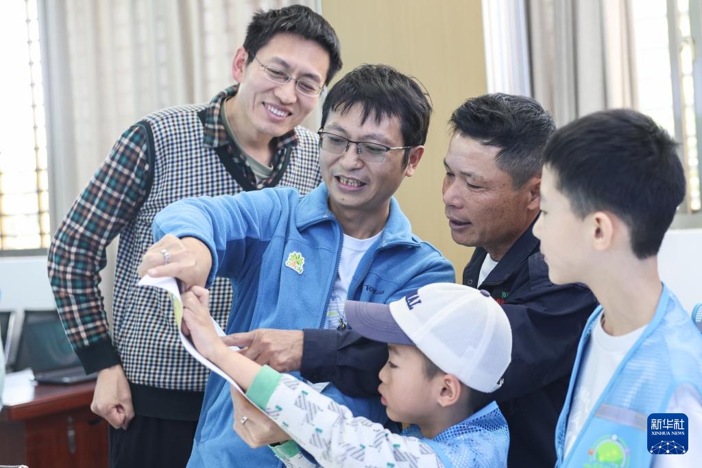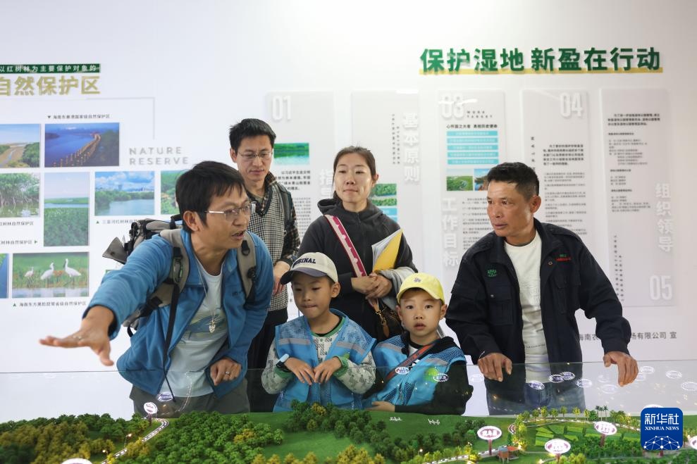 1月20日,在海南儋州新盈红树林国家湿地公园的科普馆内,罗理想(右一)给一个自然教育团队做科普工作。