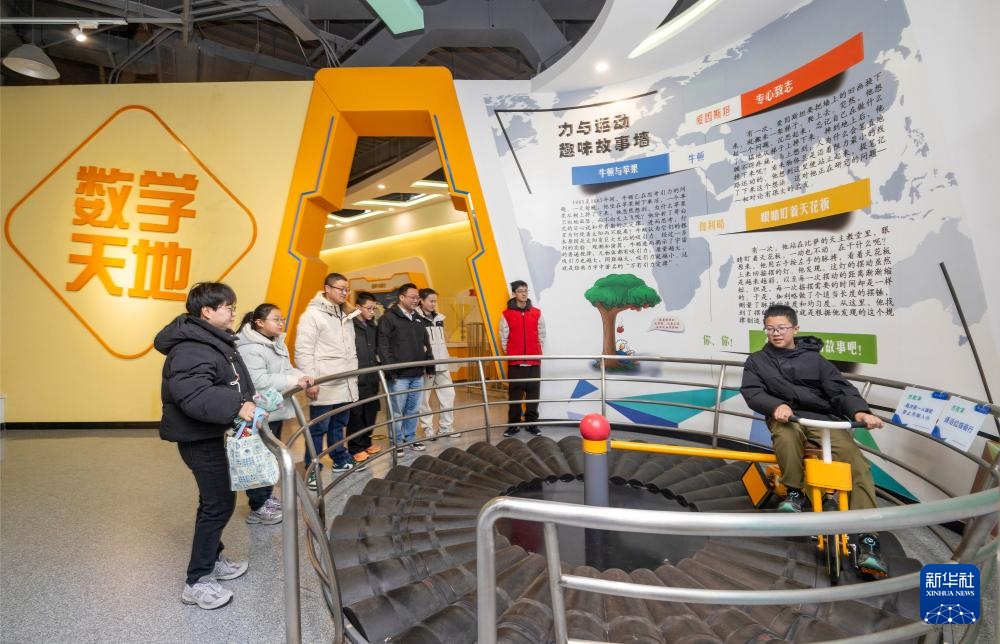 2月1日,家长带着孩子在江苏泰州科技馆体验项目。