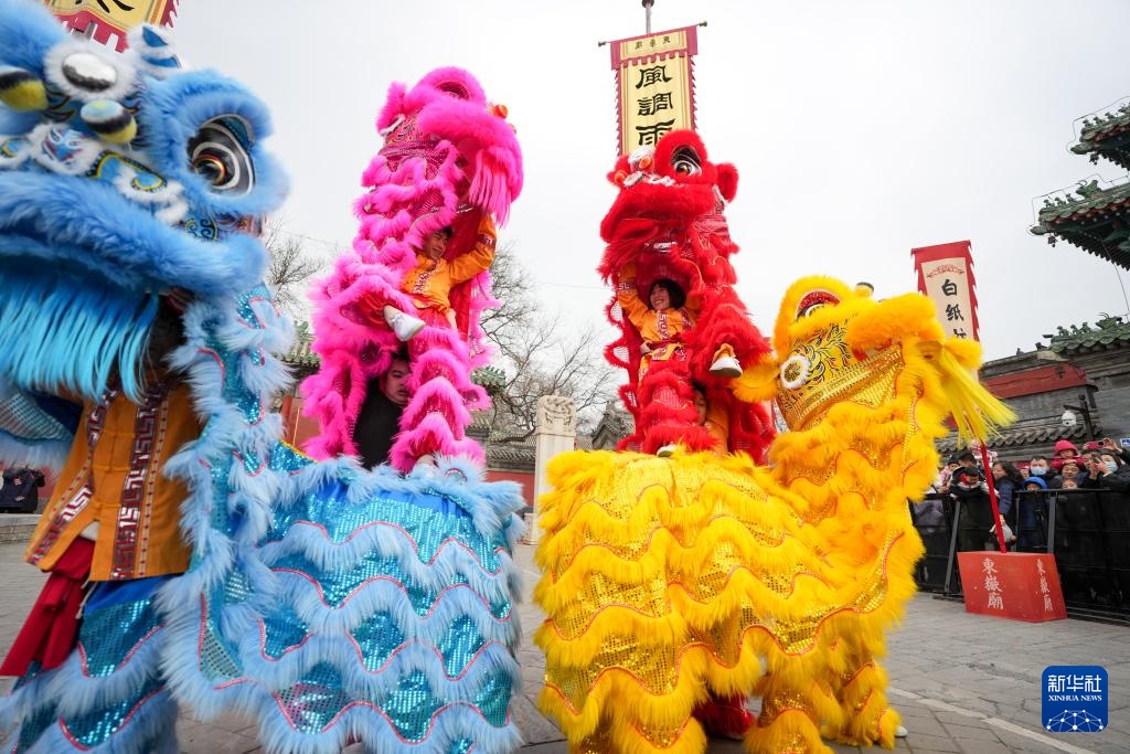 为庆贺蛇年春节,在北京民俗博物馆举行的北京东岳庙庙会上,来自全国各地的七支舞狮队伍为市民游客进行舞狮表演,共贺新春。