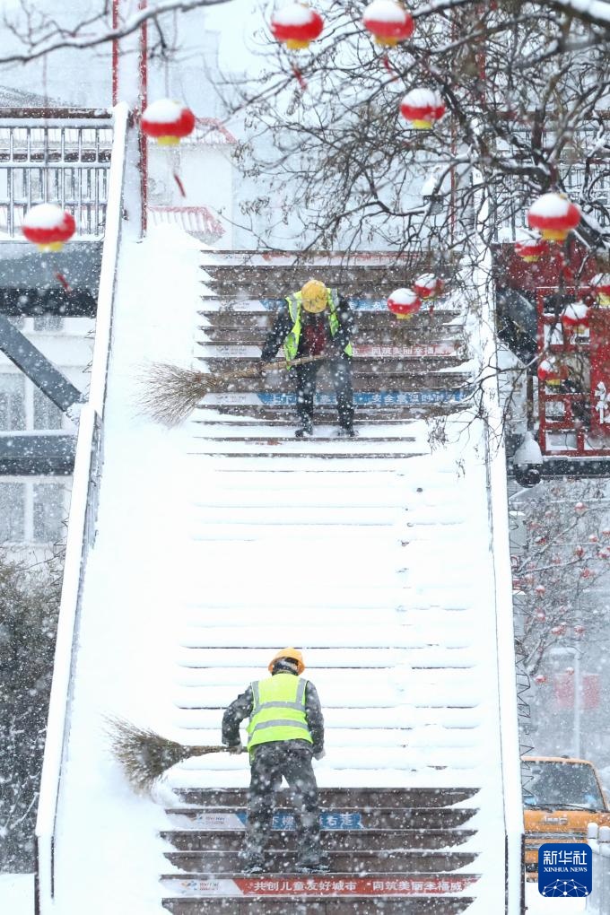 1月28日,在山东省威海市环翠区,市政工人冒雪清扫过街天桥积雪。