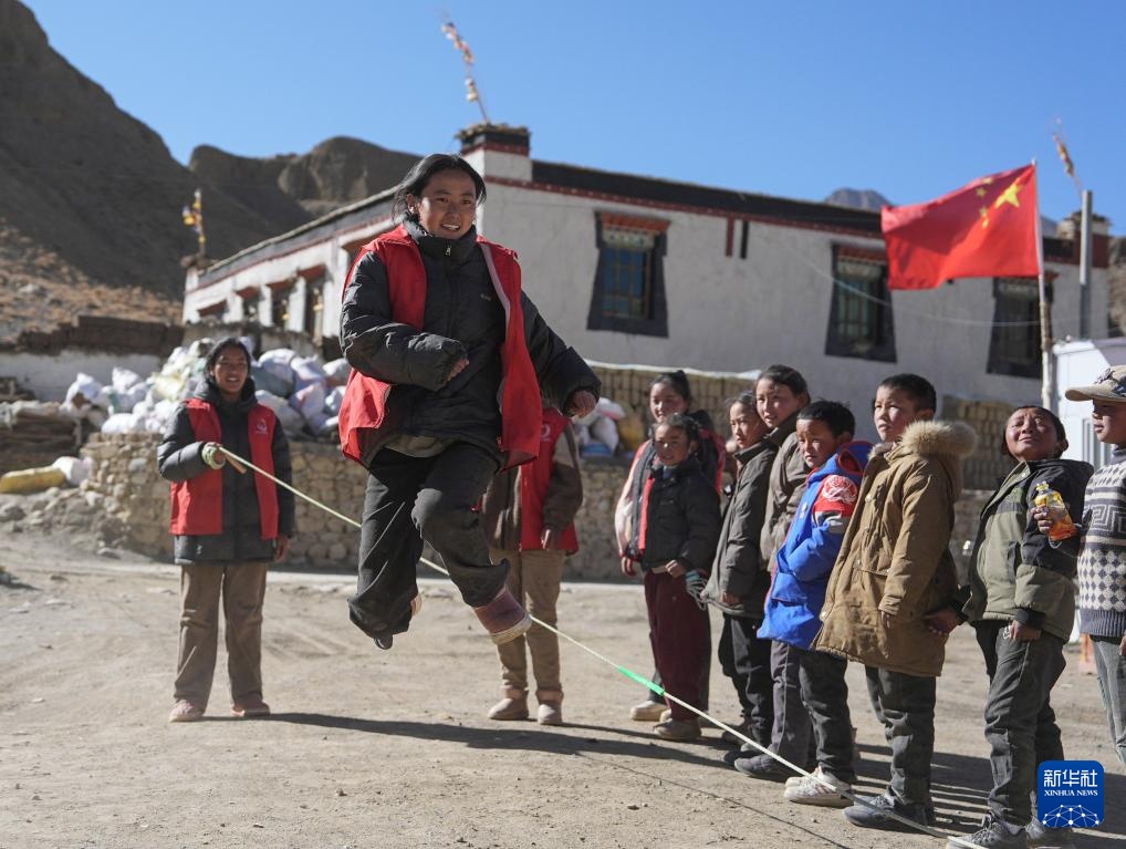 1月25日,大学生志愿者在西藏日喀则市定日县曲洛乡热木青村安置点和孩子们一起跳绳。