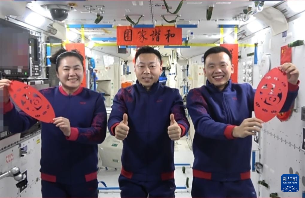 春节前夕,神舟十九号航天员乘组在中国空间站向全国人民拜年(视频截图)。