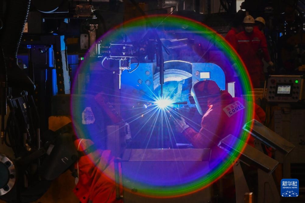 1月28日,工人在海油工程天津智能化制造基地工艺管线预制车间内操作设备。