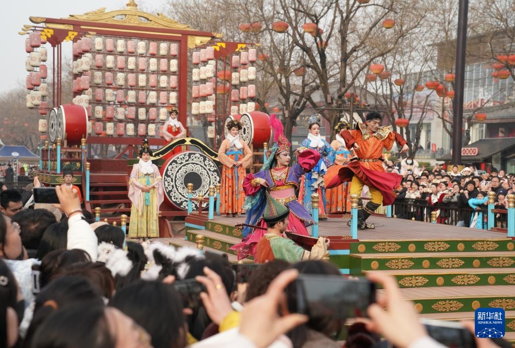 1月31日,游客在陕西西安大唐不夜城景区观看以唐代历史文化为背景创作的舞剧。