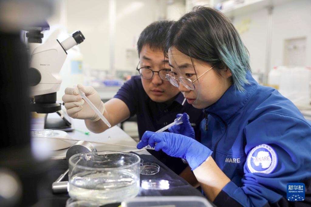 考察队员迟旭朋(左)和武佳星在船载实验室对南极浮游生物进行分样(1月26日摄)。