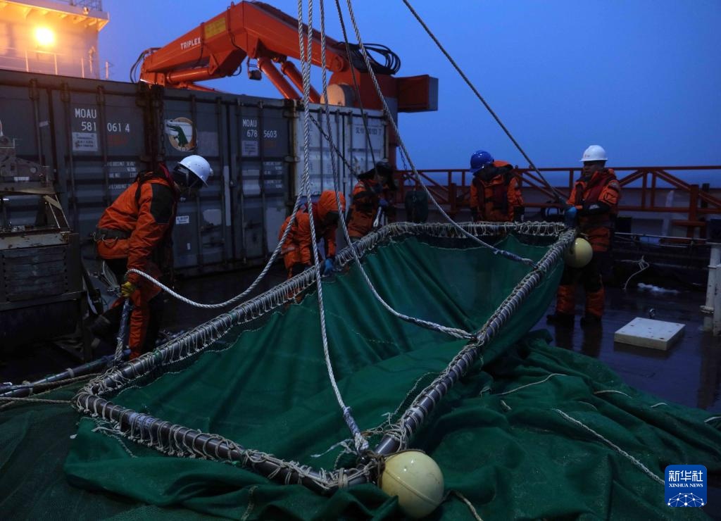 考察队员在艉甲板查看拖网收获(1月30日摄)。