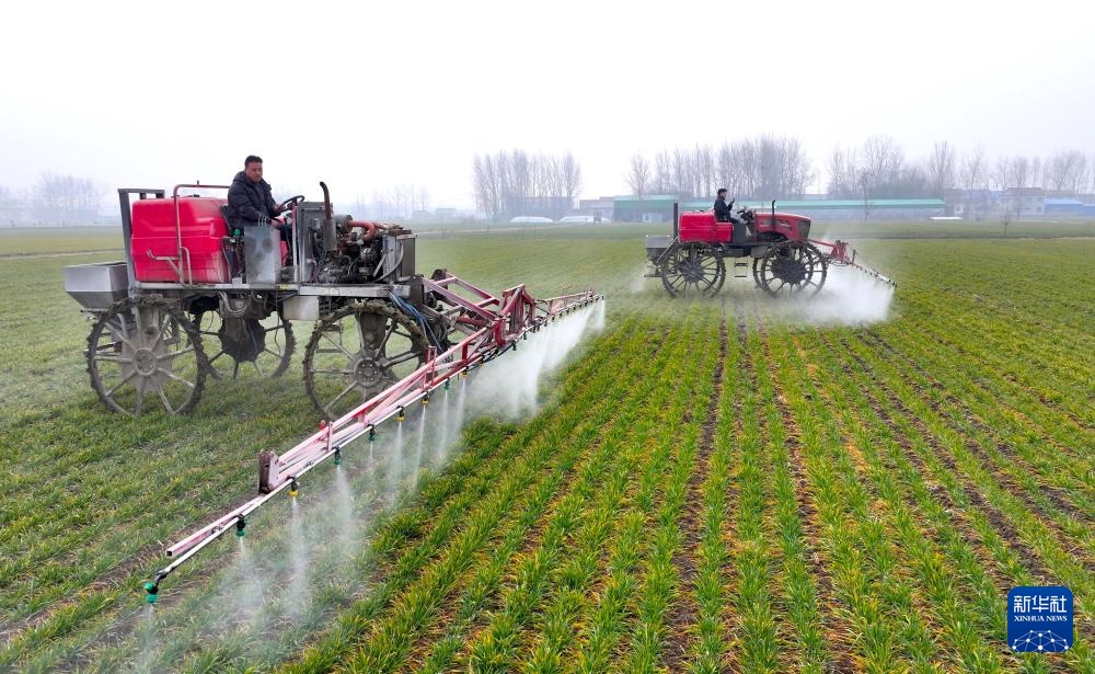 2月2日,在安徽省亳州市利辛县孙集镇许沟口村,农民驾驶机械进行田间管理(无人机照片)。