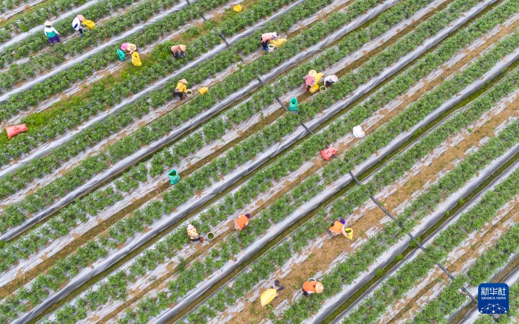 2月2日,海南省琼海市塔洋镇的农民在采收辣椒(无人机照片)。