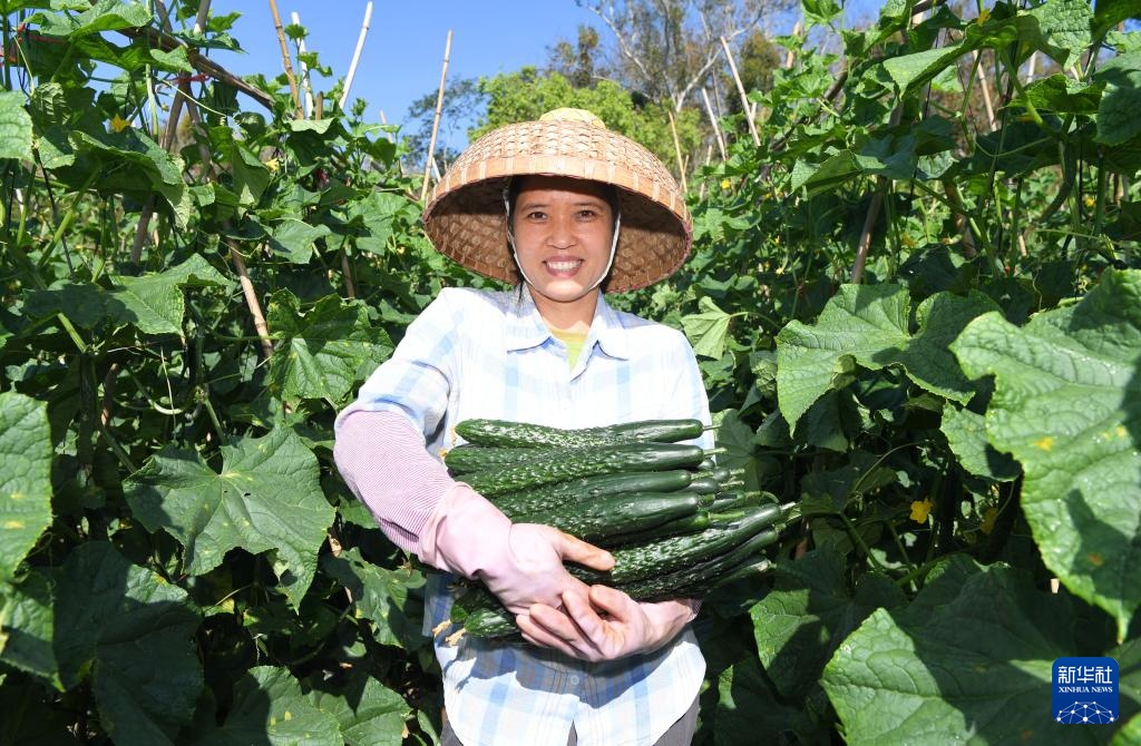 2月2日,在海南省三亚市育才生态区那受村,村民展示采摘的蔬菜。