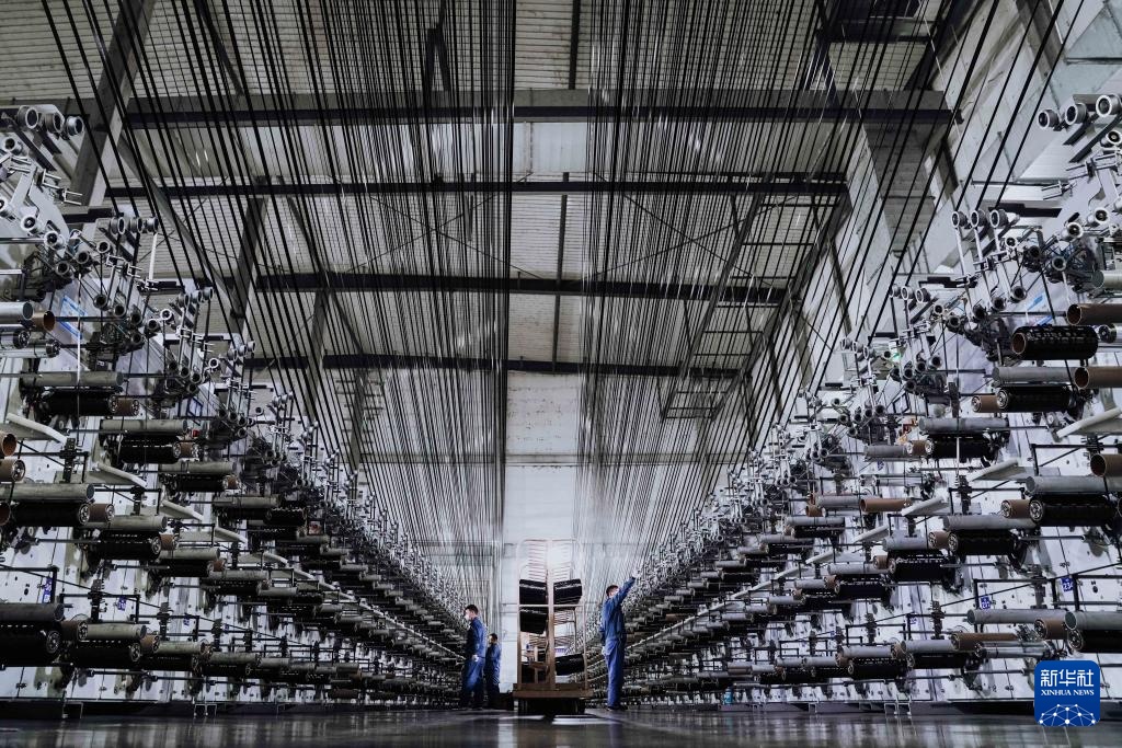 2月2日,工人在吉林化纤集团国兴碳纤维有限公司碳化二车间整理碳纤维原丝。