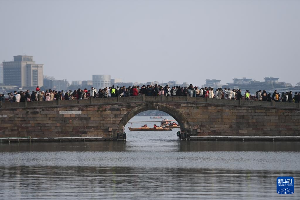 2月3日,杭州西湖景区断桥上游人络绎不绝。