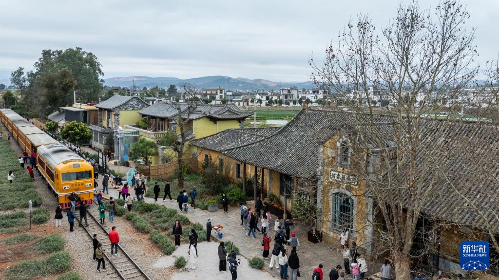 2月3日,在云南省建水县,乘坐建水小火车的游客来到乡会桥站游览(无人机照片)。