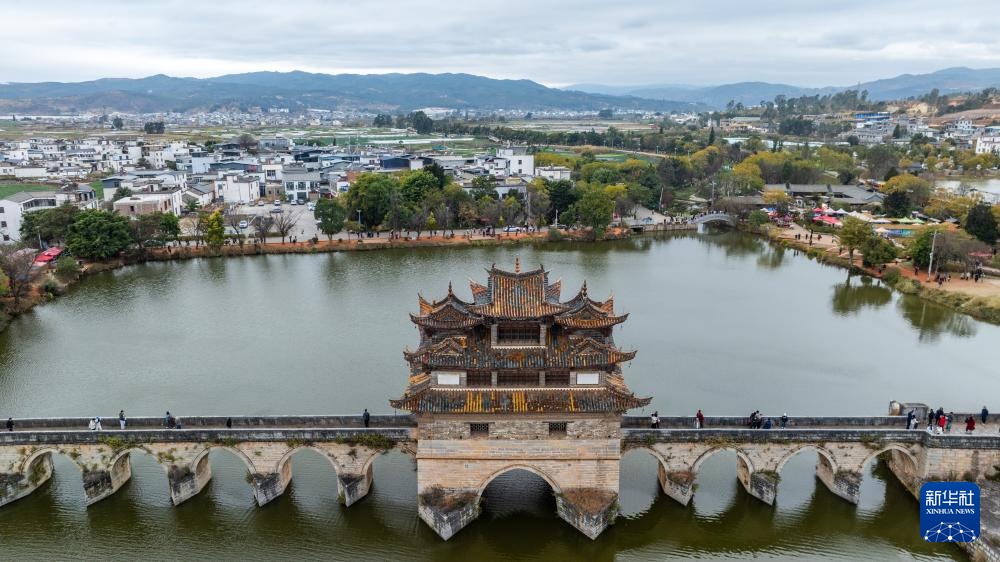 2月3日,游客在云南省建水县双龙桥游览(无人机照片)。