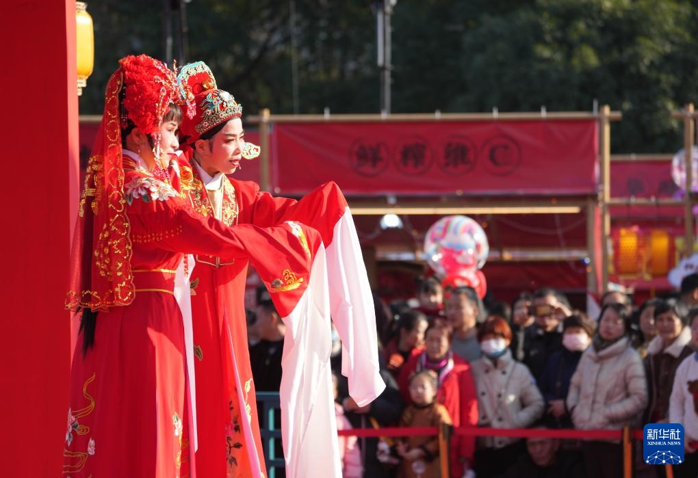 在绍兴市越城区,演员在“绍兴古城过大年”活动上表演越剧《何文秀》选段(1月29日摄)。