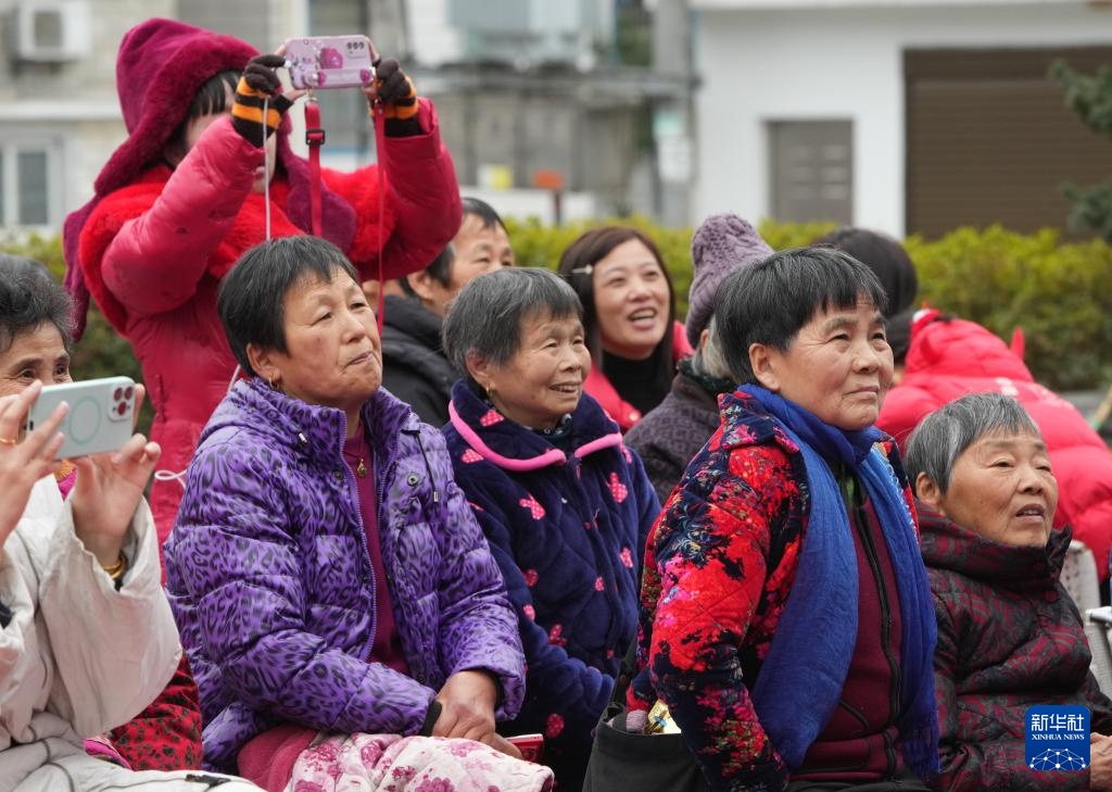 绍兴市柯桥区夏履镇莲增村村民在村口的戏台前观看民间越剧团晶蕾艺术团表演的越剧《五女拜寿》(1月25日摄)。
