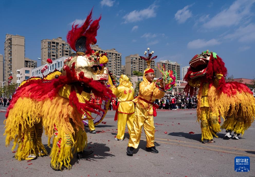 2月6日,人们在南涧县龙灯会上表演舞狮。