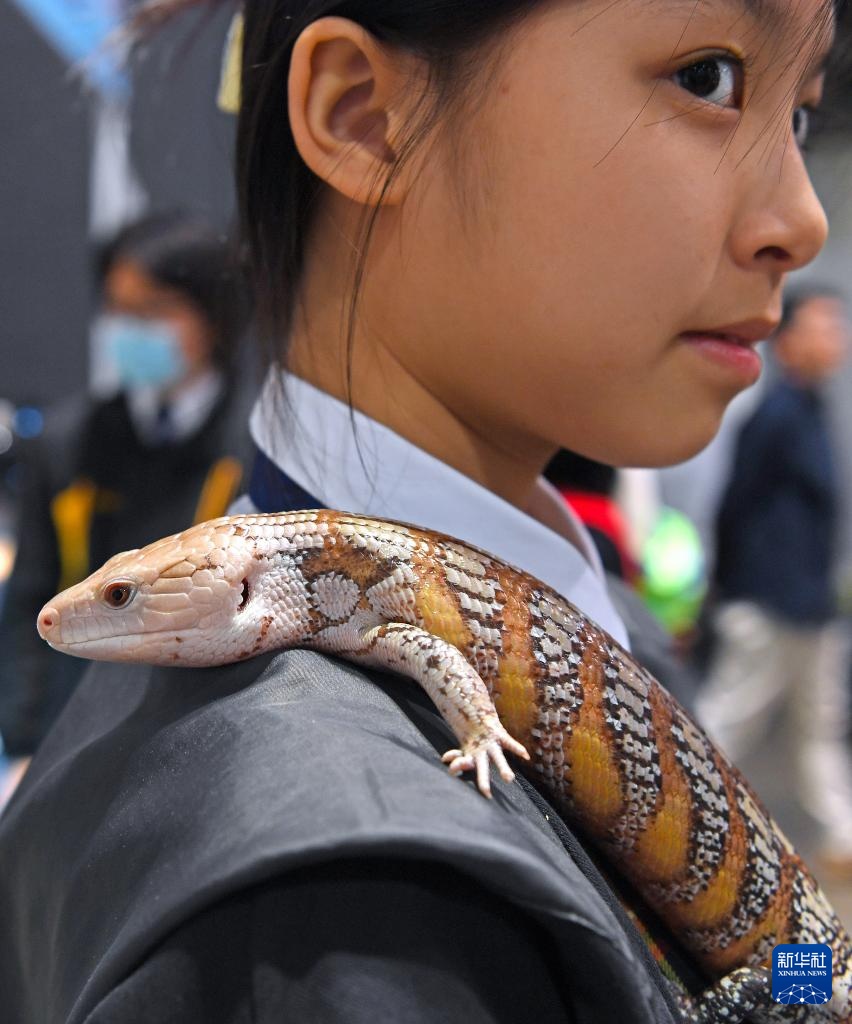 2月6日,在香港会议展览中心,参展商展示一只蓝舌石龙子。