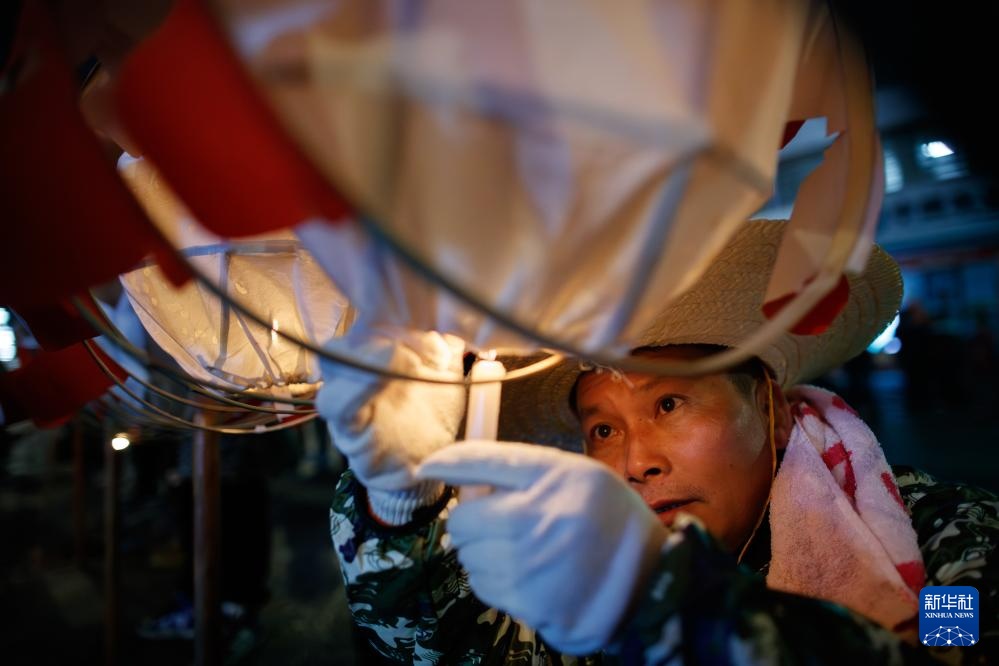 2月6日,一名舞龙队员在点亮龙身中的蜡烛。
