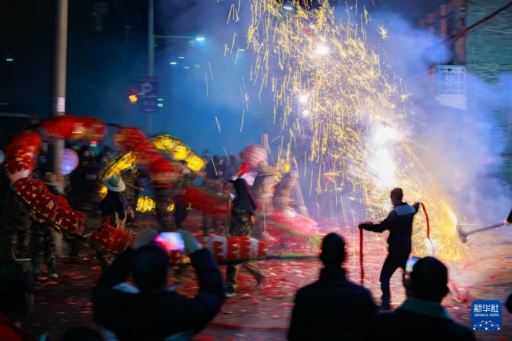 2月6日,人们在舞龙队伍经过时进行“嘘花”活动。