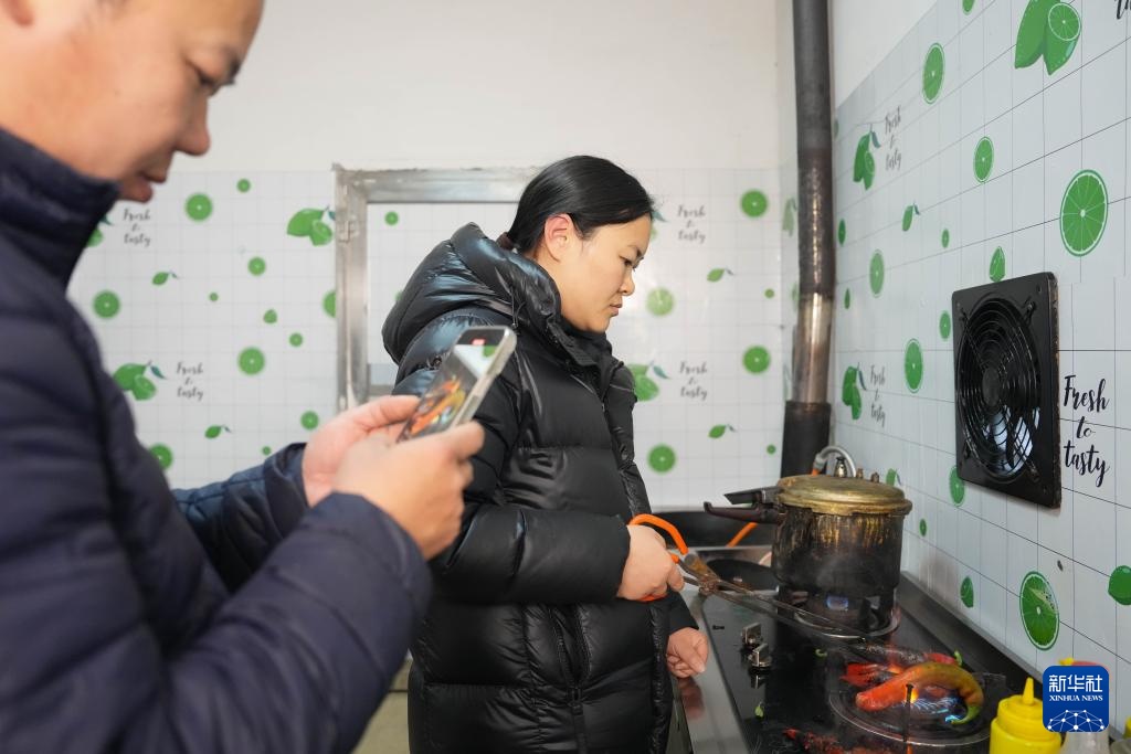 2月6日,贺小贞(右)在宁乡市肖胜蓝家庭农场内用自家种植的辣椒做“烧辣椒”,肖胜蓝在一旁拍摄视频用于宣传。