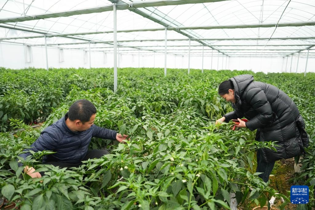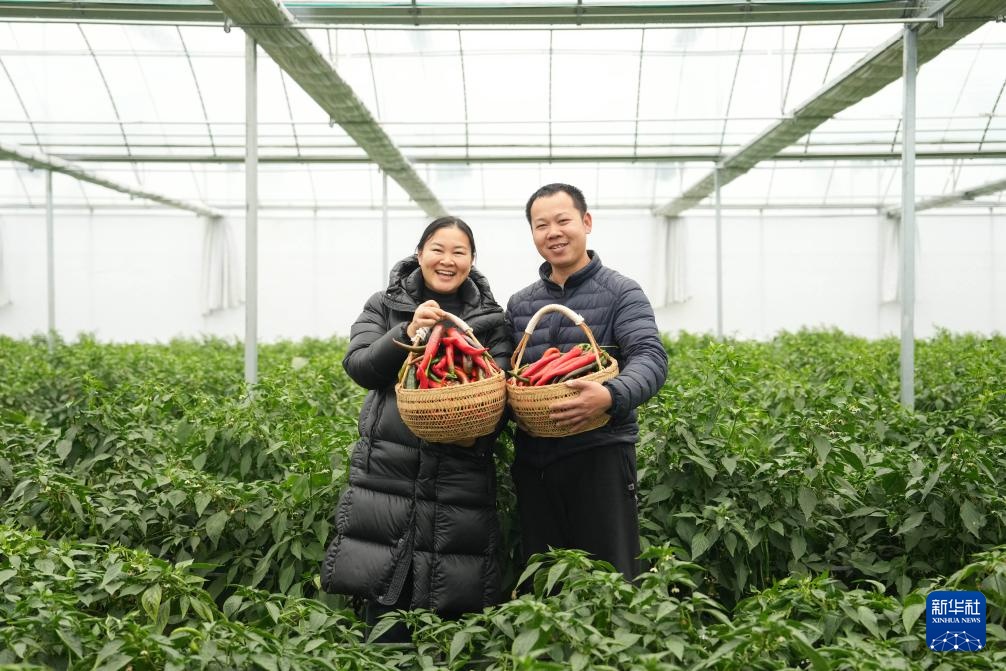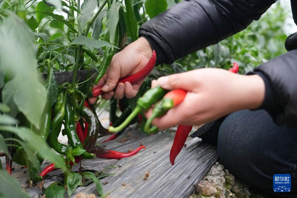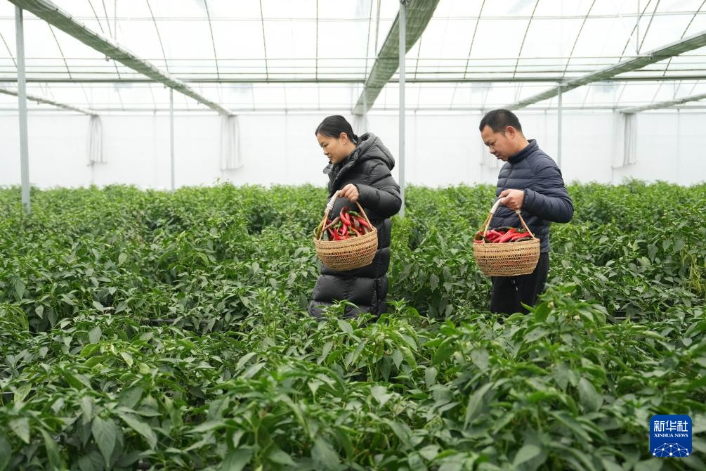 2月6日,贺小贞在湖南省宁乡市肖胜蓝家庭农场采摘辣椒。
