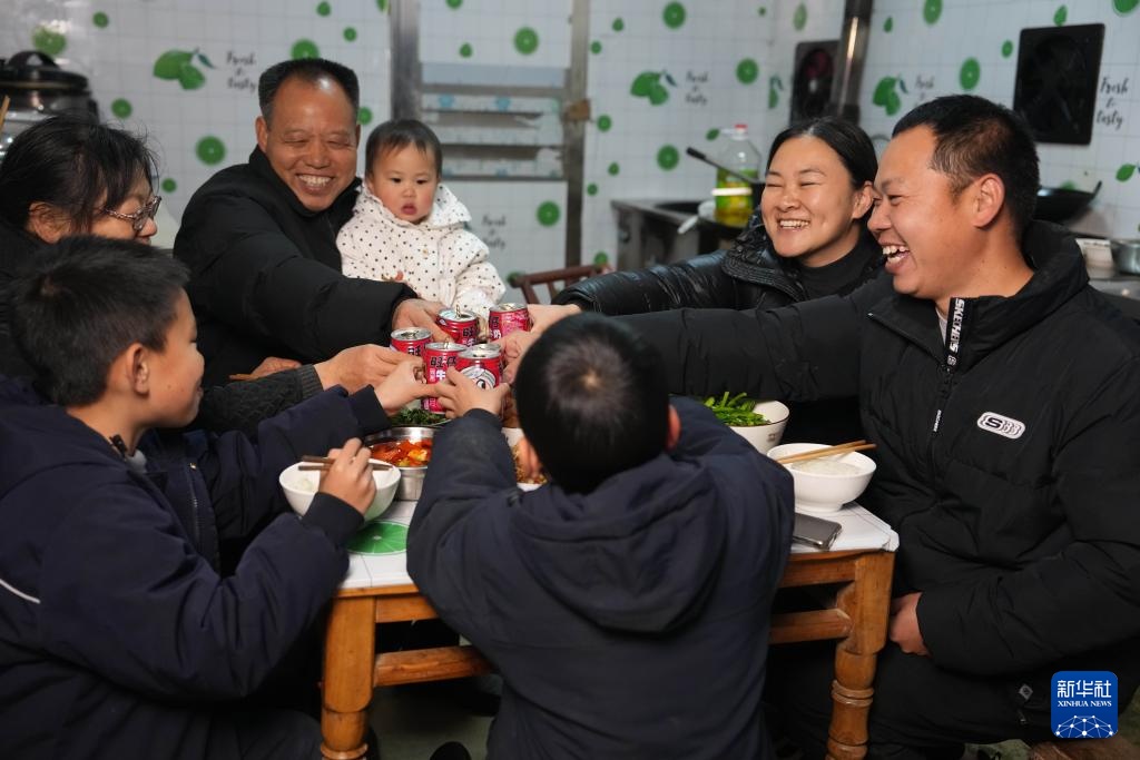 2月6日,肖胜蓝(右一)、贺小贞(右二)在宁乡市肖胜蓝家庭农场内和家人们共进晚餐。
