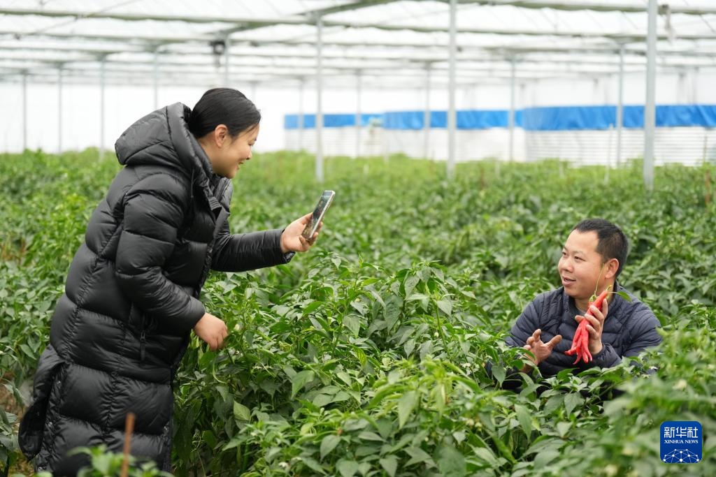 2月6日,肖胜蓝(右)、贺小贞在宁乡市肖胜蓝家庭农场采摘辣椒时拍摄视频。