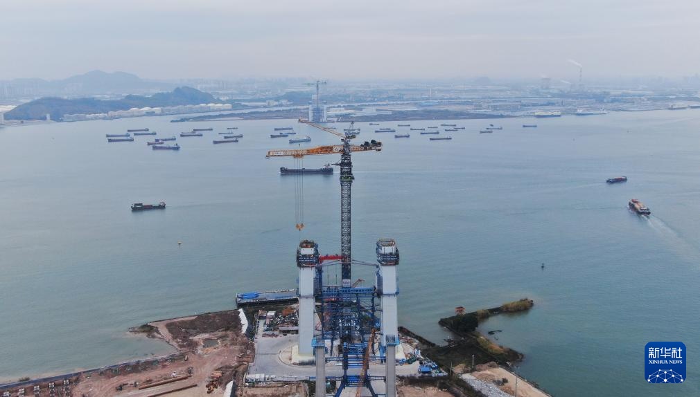 这是狮子洋通道主桥狮子洋大桥施工现场(2月6日摄,无人机照片)。