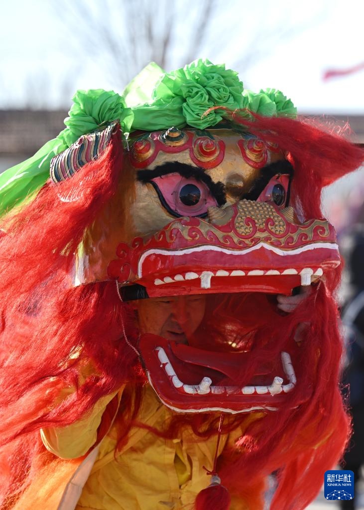2月7日在天津市北辰区双口镇中河头村拍摄的北仓随驾狮子展演。