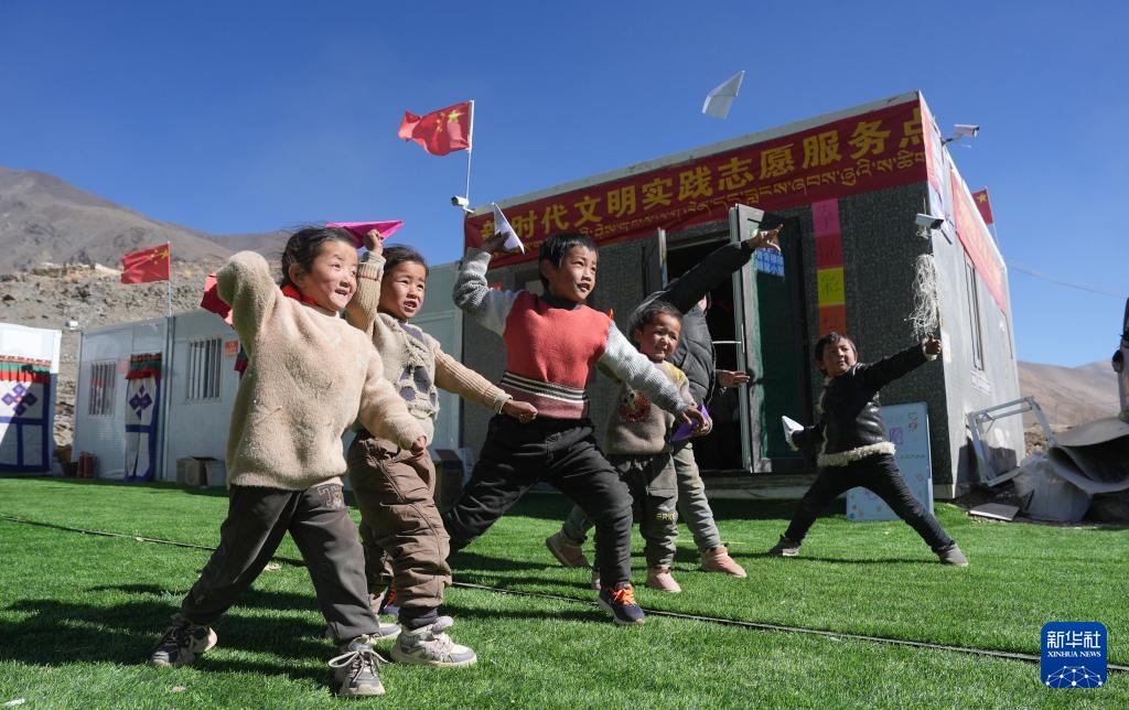 1月24日,定日县古荣村安置点的孩子们在放飞纸飞机。