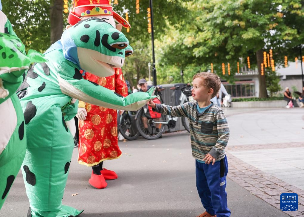 2月7日,小朋友在新西兰克赖斯特彻奇新春嘉年华活动上与青蛙人偶互动。