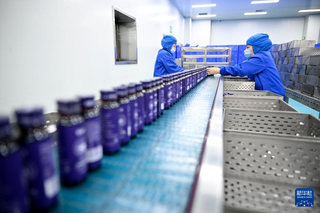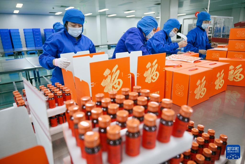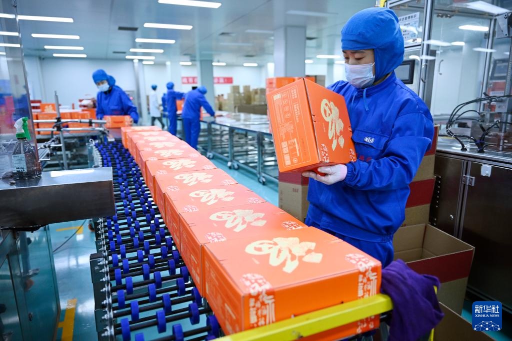 2月7日,工作人员在位于银川市贺兰县的宁夏百瑞源包装车间打包枸杞产品。
